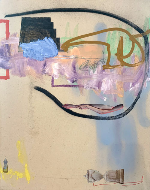 Dazwischen eine Malerei von mir, in der eine janusgesichtige Figur aus dunklem Grund hervortritt, von unleserlichen Graphemen umgeben wie von unbestimmten Gedanken.