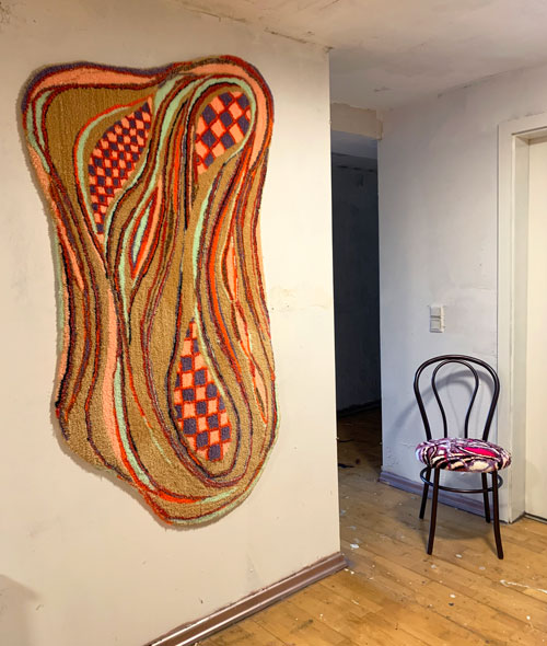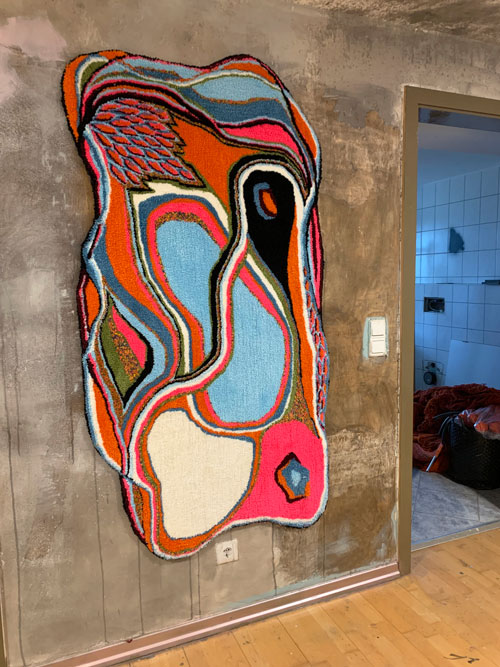 Im Heute angekommen sind die Werke von Michael Holtgrewe. Seine ungegenständlichen Motive entstehen spontan während des Arbeitsprozesses. Frei, ohne Vorzeichnung entwickeln und verdichten sich die Arbeiten über Wochen zu einem Teppichobjekt. Seine Formen- und Farbsprache erinnert an Pop Art.